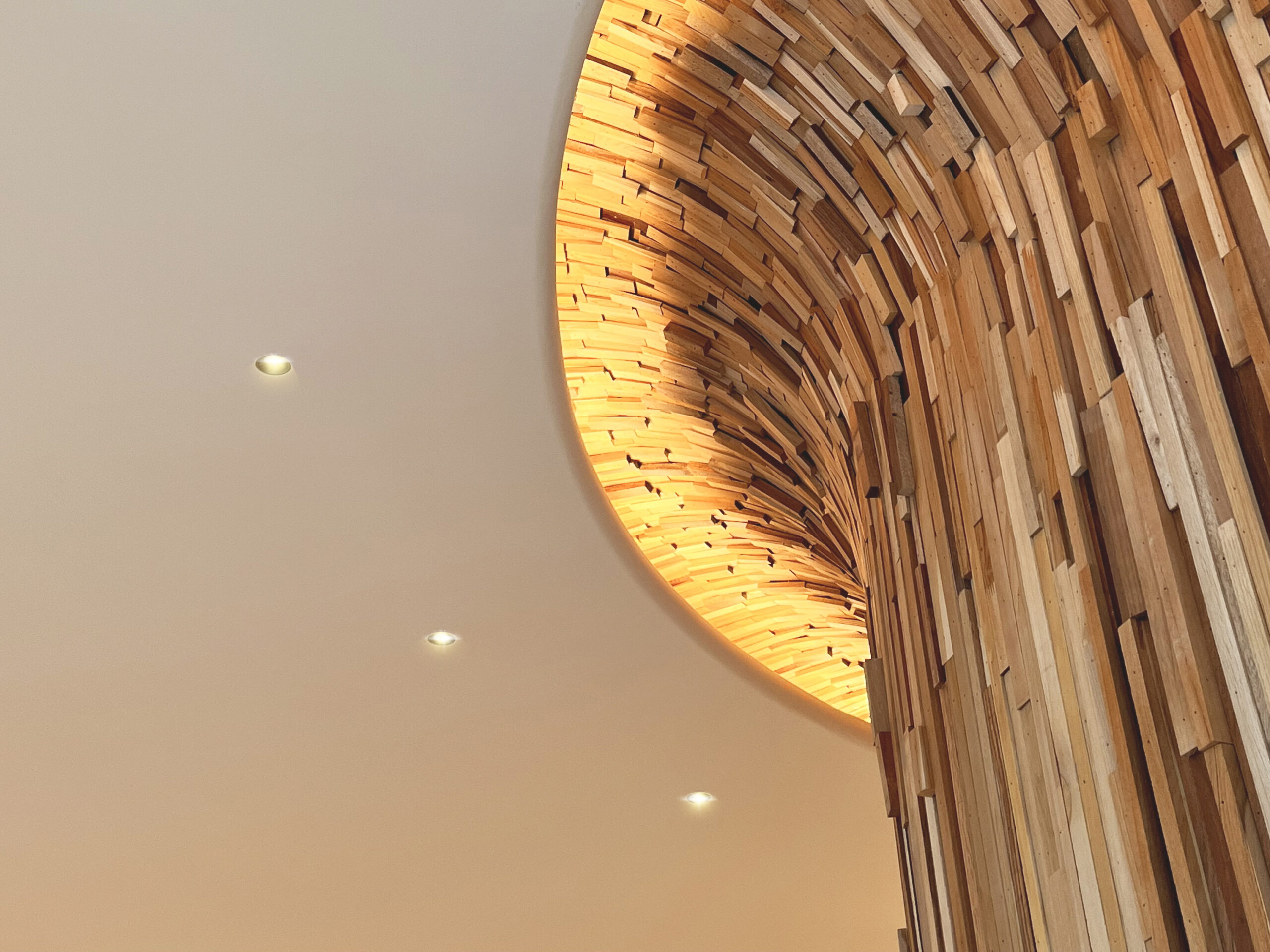 Véritable signal intérieur, cet arbre attire naturellement le regard depuis la rue et structure l’espace. Il porte à la fois l’identité conceptuelle de la boutique et le récit de la marque, mettant en valeur la beauté des assemblages et la noblesse des essences de bois massif.